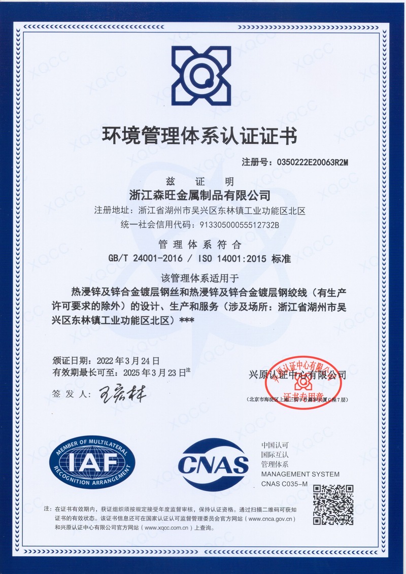 浙江森旺金屬制品有限公司成立于2012年,坐落湖州市吳興區東林鎮工業功能區。公司專業從事各類鍍鋅鋼絲、鋼絞線等產品的開發及生產。目前產品已廣泛應用于各類通信光電纜,電力輸送,電氣化鐵路工程,各類堤壩防護及農業溫室等工程領域。公司秉承“追求卓越品質,創建卓著信譽”的經營理念,始終堅持專業化、規模化的經營模式。